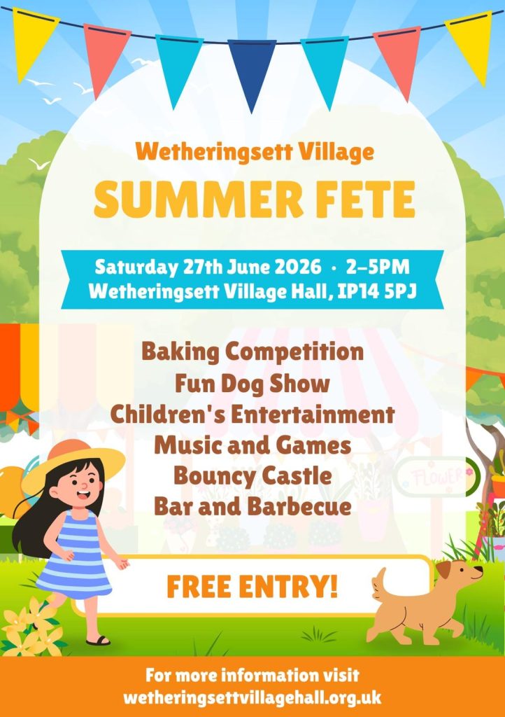 We can now confirm that Wetheringsett’s Summer Fete will take place on Saturday 27 June 2026 on the Village Hall Meadow, and we’re now inviting:
